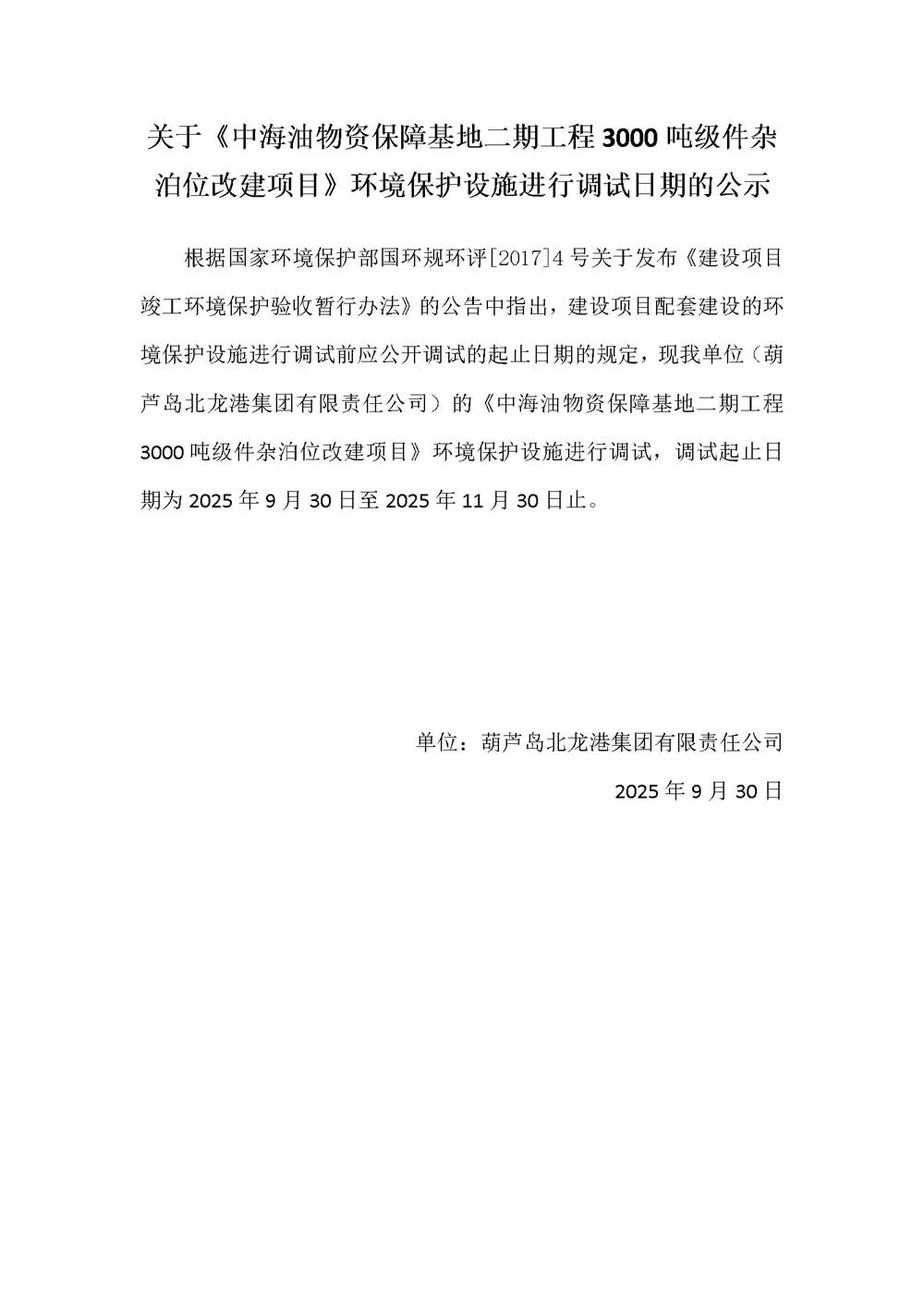 關于《中海油物資保障基地二期工程3000噸級件雜泊位改建項目》環境保護設施進行調試日期的公示